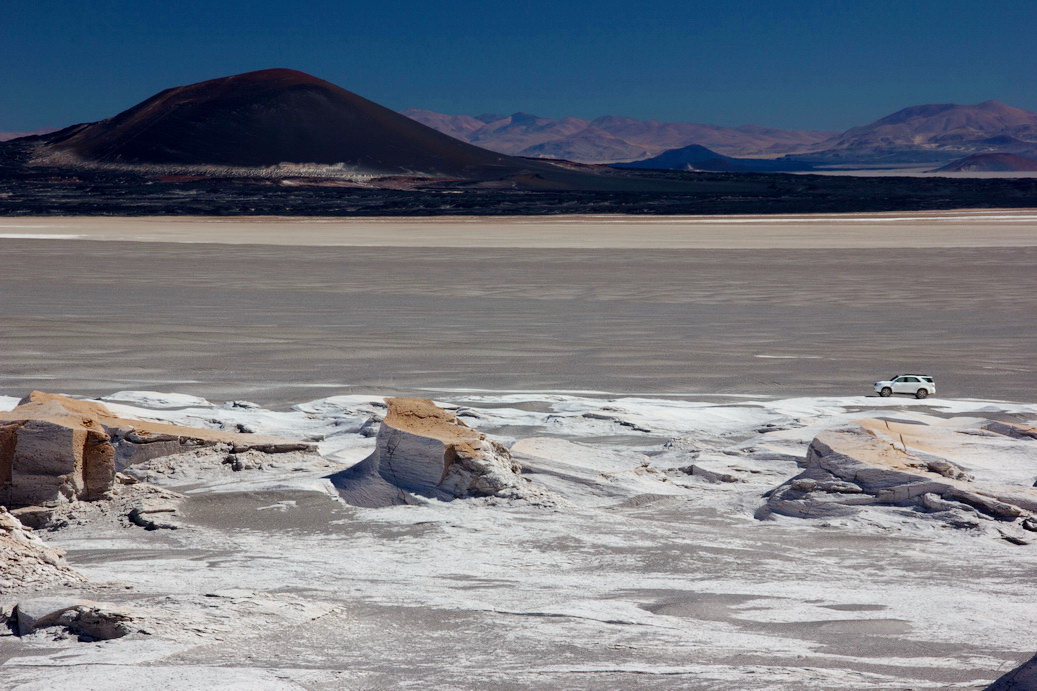 Luego del desayuno, dejamos atrás el pueblo de El Peñon para luego de unos 50 km llegaremos a Antofagasta de La Sierra cuya vista de la laguna con flamencos y los dos volcanes que dominan el paisaje: el Antofagasta y el Alumbrera dan un marco espectacular al entorno. Pasando el pueblo comenzaremos nuevamente un camino minero por la Quebrada de Calalaste y ascendiendo hasta el abra de Antofalla a 4.630 mts. sobre el nivel del mar divisaremos la totalidad del salar de Antofalla desde su mirador, junto con muchos volcanes extintos alrededor. Descenderemos hasta el nivel del salar y desde alli al pequeño pueblo de Antofalla donde viven unas 15 familias pudiendo almorzar en alguna comedor de los que hay en el pueblo que proveen servicios a los mineros que exploran litio en el salar. Luego del almuerzo continuamos por el salar visitando la laguna Verde y su espectacular show de colores junto a la sal, las montañas volc{anicas y seguramente un cielo azul intenso como son mayormente los dias en la Puna de Atacama, continuando desde alli, terminaremos el salar atravezando el limite provincial ingresando nuevamente en la provincia de Salta e inmediatamente el gran Salar de Arizaro con su ícono el Cono de Arita que desde lejos se lo ve como si sería una pirámide solitaria en la superficie blanca. Atravesaremos el gran salar por espacio de 1 hora aproximadamente para terminar nuestro día en el pueblo de Tolar Grande donde nos alojaremos en algún hospedaje disponible del pueblo.